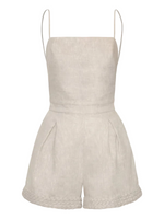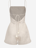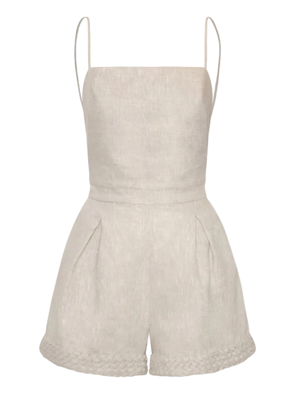 The Puertos Lejanos by Andres Otalora is a  jumpsuit embellished with subtle detailing. Its lightweight silhouette and oatmeal tone evoke coastal calm, making it a fresh and feminine piece.