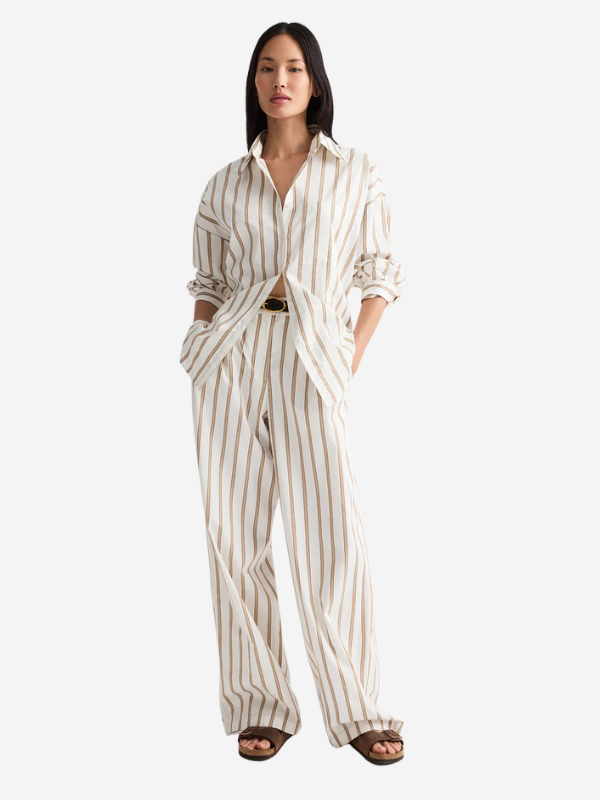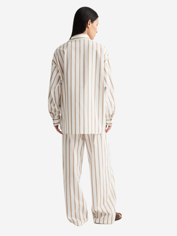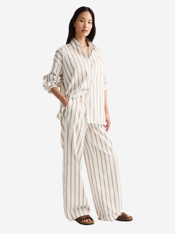 TWP's Hudson Street Pant is a relaxed mid-rise pant in yarn-dyed Superpop stripe. Crafted from compact cotton poplin, their signature Superpop fabric is reimagined with a refined striped pattern. Designed with front pleats that open into a softly draped, wide-leg silhouette. Finished with an elasticized back waistband, side-seam pockets, a single back welt pocket, and subtle topstitch detailing throughout.