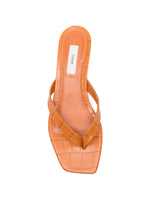 Close-up detail of the Croco-embossed Heeled Flip Flops in Tangerine, highlighting the premium leather texture by TOTEME.