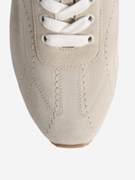 Close-up of Flex Suede Sneakers in Stone highlighting the tonal stitching and lace-up design, perfect for relaxed tailoring or weekend wear.