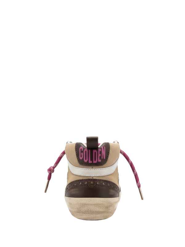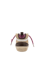 The Mid Star sneakers by Golden Goose take a refined approach to their Nineties skate scene inspiration. This women's model with a beige suede upper features a white star, a brown leather heel tab, and a white cotton flash. The pink laces complete the look.