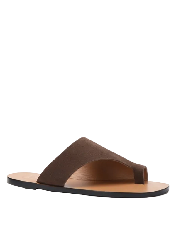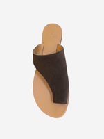 Close-up of the Rosa Sandal in Walnut Suede by ATP Atelier, highlighting the luxurious suede material and elegant design.