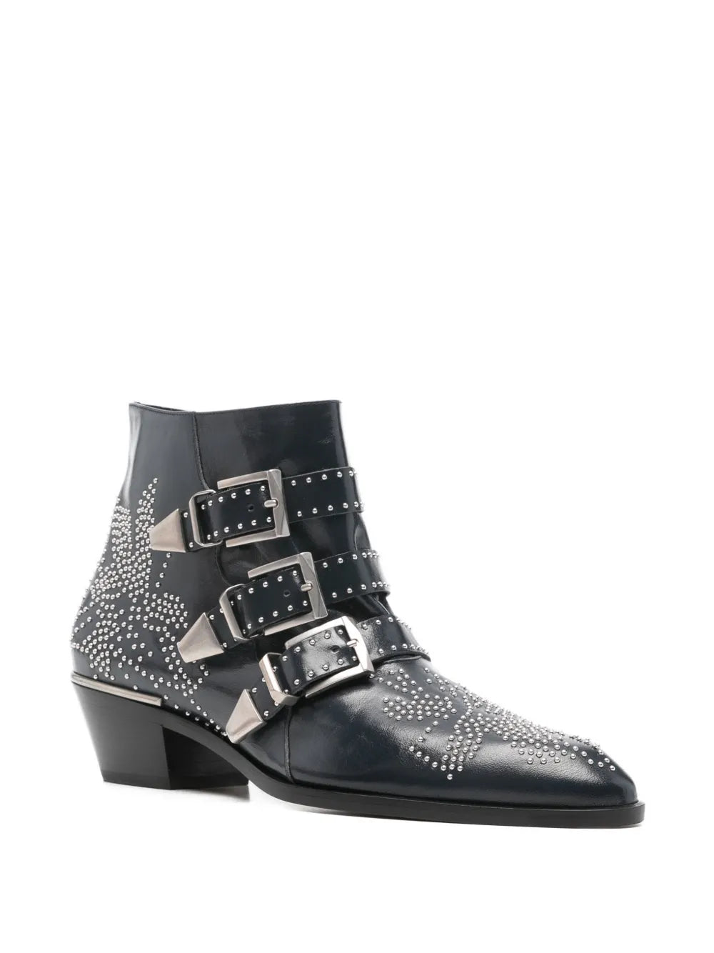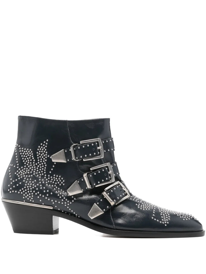 The Chloé Susanna Short Boot in Deep Navy featuring elegant studs and a striking elongated toe design.