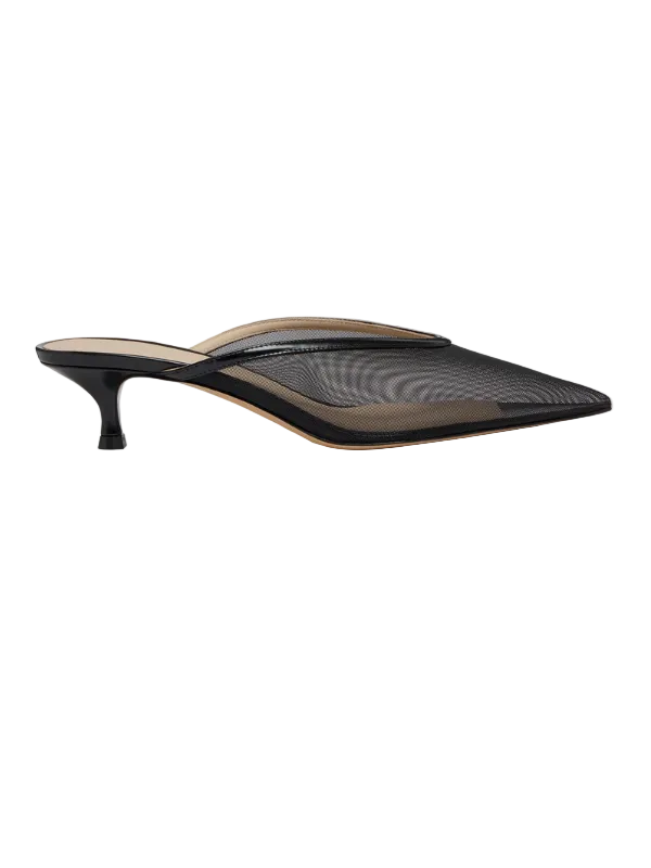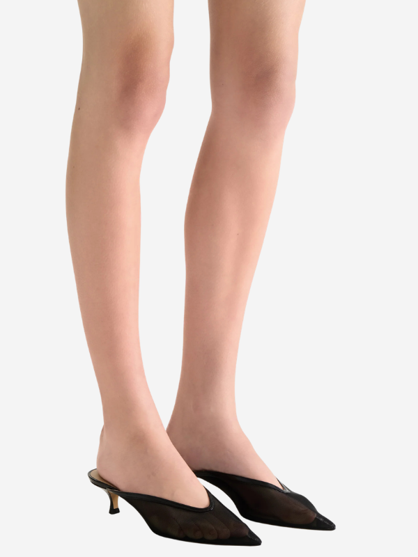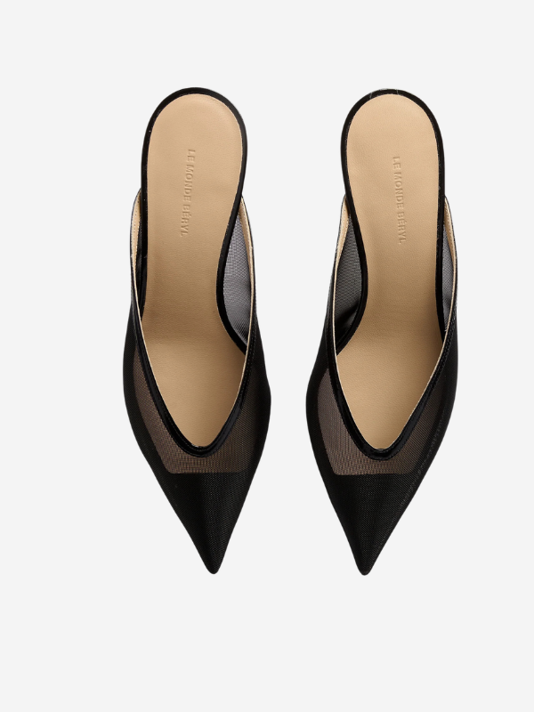 Pair of Venetian Kitten Mule in Black by Le Monde Béryl showcasing the chic black mesh material and stylish silhouette.