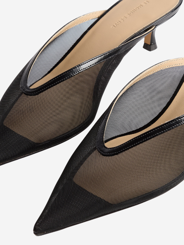 Close-up view of the Venetian Kitten Mule in Black by Le Monde Béryl, emphasizing the luxurious mesh and classic pointy toe.