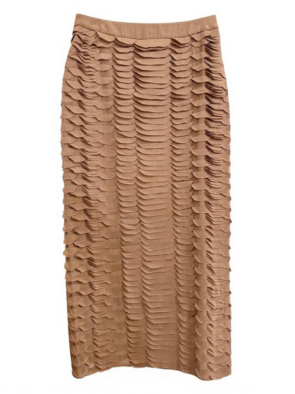 TWP's Sylkie is a mid-rise straight-cut skirt embellished with tonal fabric scales throughout. The Sylkie falls to a midi length with a center-back slit and finished with a concealed side zip closure.