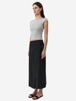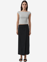 Model wearing the Organic Cotton Off Shoulder Top in Grey Marie by St. Agni, paired with a black skirt for a stylish look.