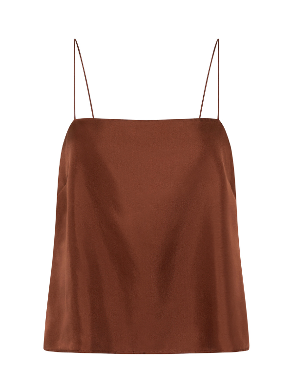 Detailed shot of the St. Agni 90s Silk Twill Cami in Brick, emphasizing the subtle bust darts and rouleau straps.