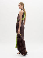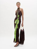 Close-up of the Tizziana Maxi Dress in Green Flower showing the delicate silk fabric and tie closure at the neckline.