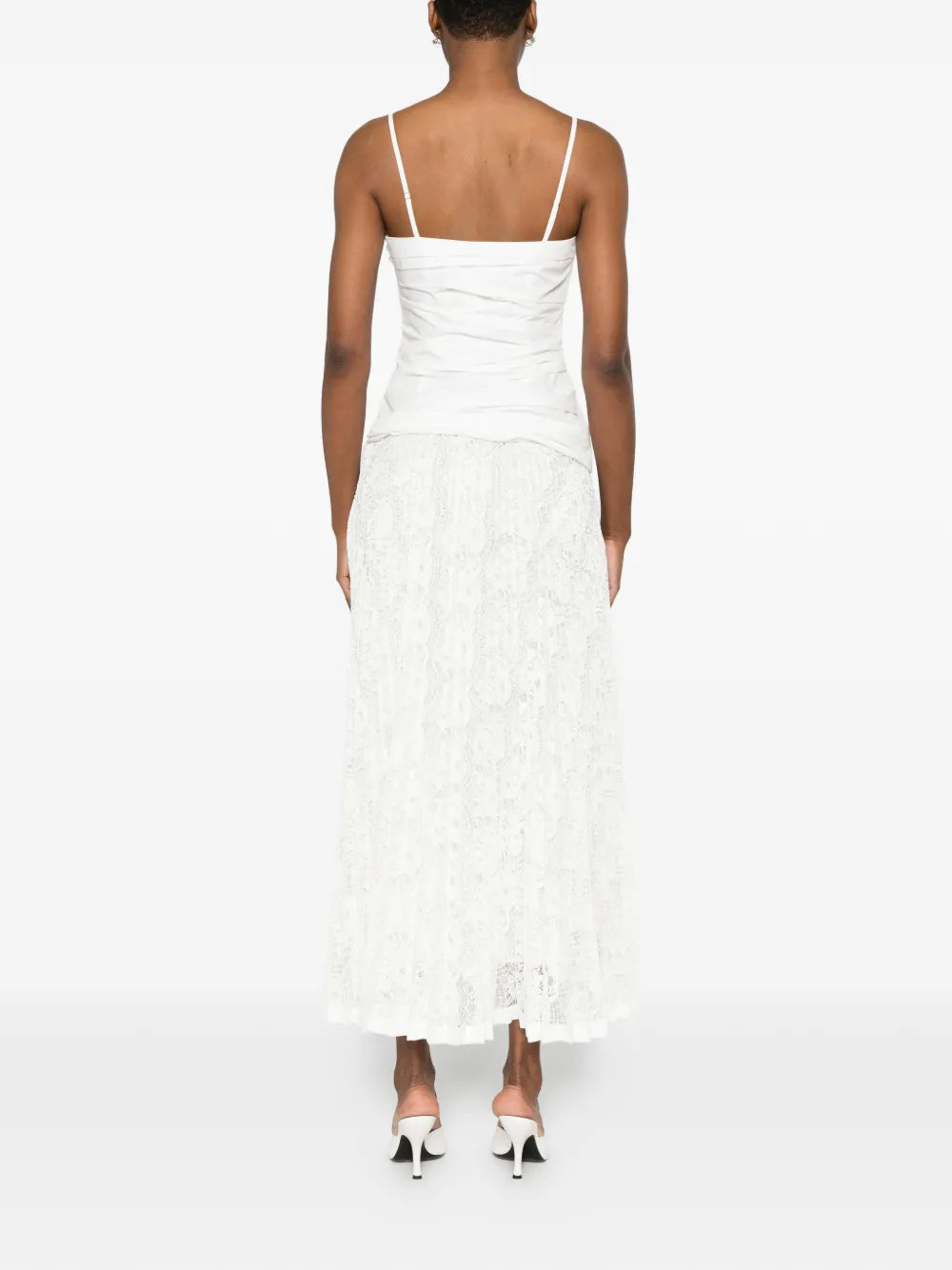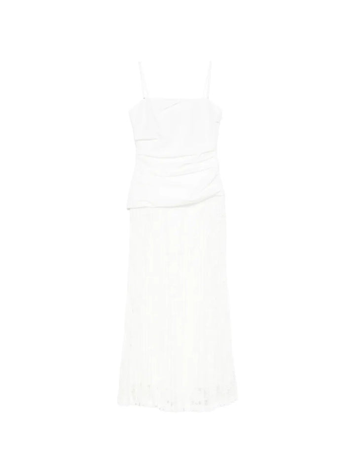 The Annalise Dress by Simkhai features a strapless ruched bodice in poplin and a pleated lace skirt.