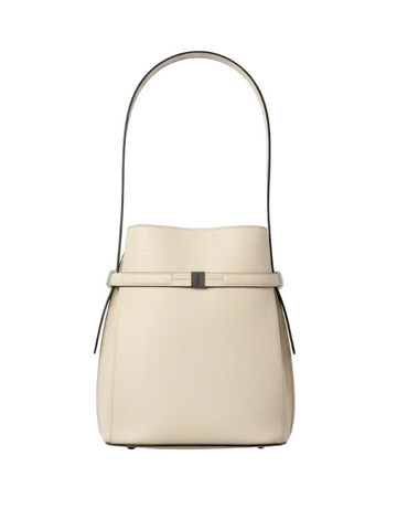 TOTEME Belted Grained Bucket Bag in Milk, featuring a modern bucket silhouette with an elegant belt, crafted from pebble-grained leather. Ideal for chic and sophisticated styling.