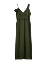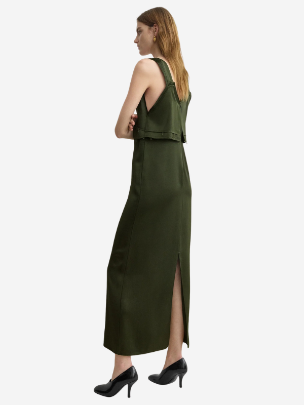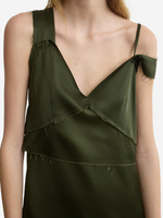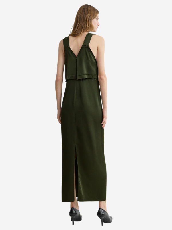Back view of the V-Neck Slip Dress in Bottle Green by TOTEME, featuring a stylish design with asymmetric straps.