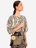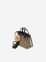 Close-up of Ulla Johnson's Raffia Mini Crossbody in Noir Natural featuring luxurious black leather and raffia.