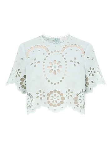 Awaken Embroidered Bodice in Mint by Zimmermann, showcasing the elegant linen top with short sleeves and scalloped trim.
