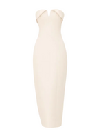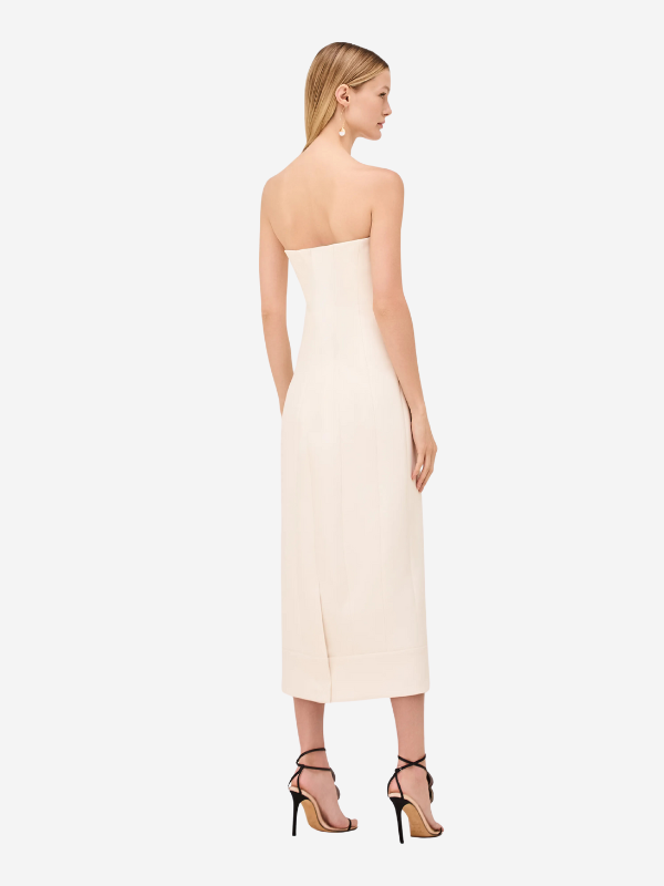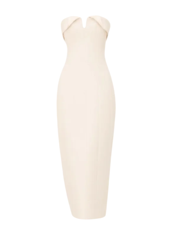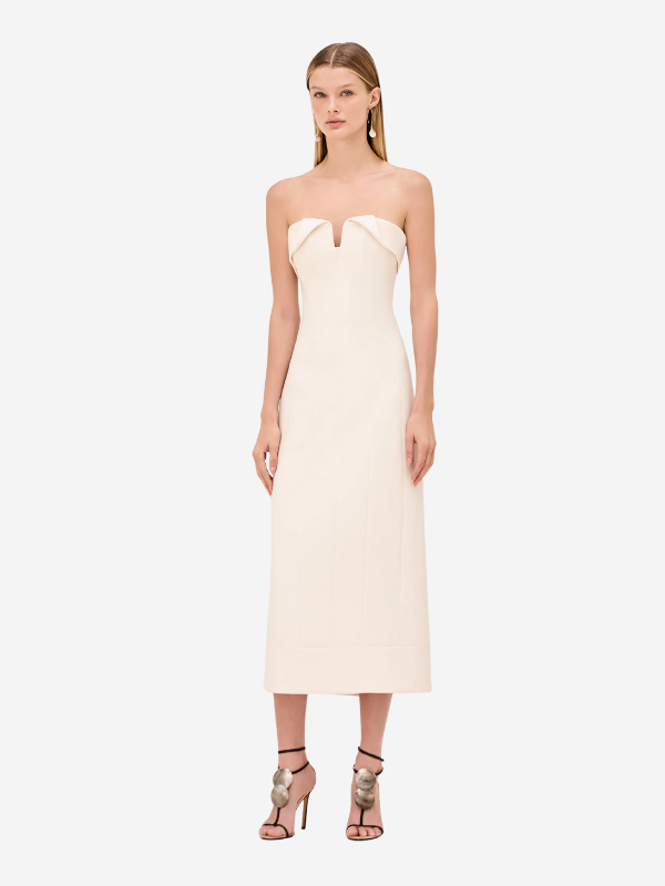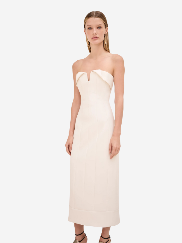 The Donella Dress by Alexis is a strapless midi silhouette with a sculptural neckline and vertical paneling detail.