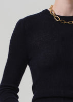 Front view of the Alessia Crewneck Sweater in Navy styled with denim, perfect for a casual yet refined look.