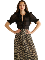 The Balsam Top by Doen features a Peter Pan collar and short puffed sleeves adorned with pin tucks. Horizontal clustered pin tucks, slightly cropped bodice, while mother-of-pearl buttons extend down the front. The collar and sleeve cuffs are trimmed with scallop-edged lace.