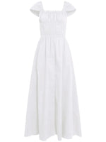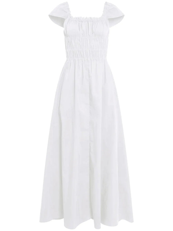 Model wearing the Lily Dress in Optic White, demonstrating the dress's whimsical elegance and comfortable fit.