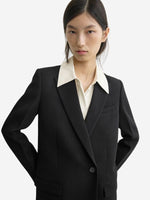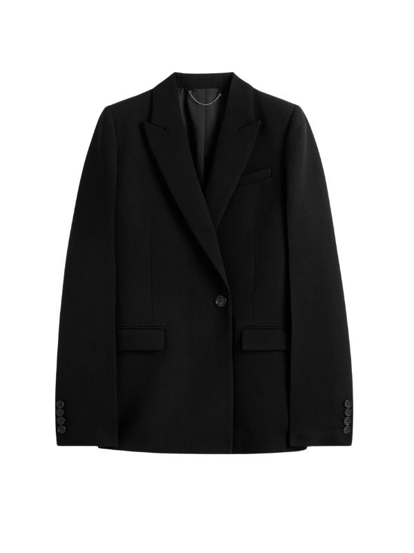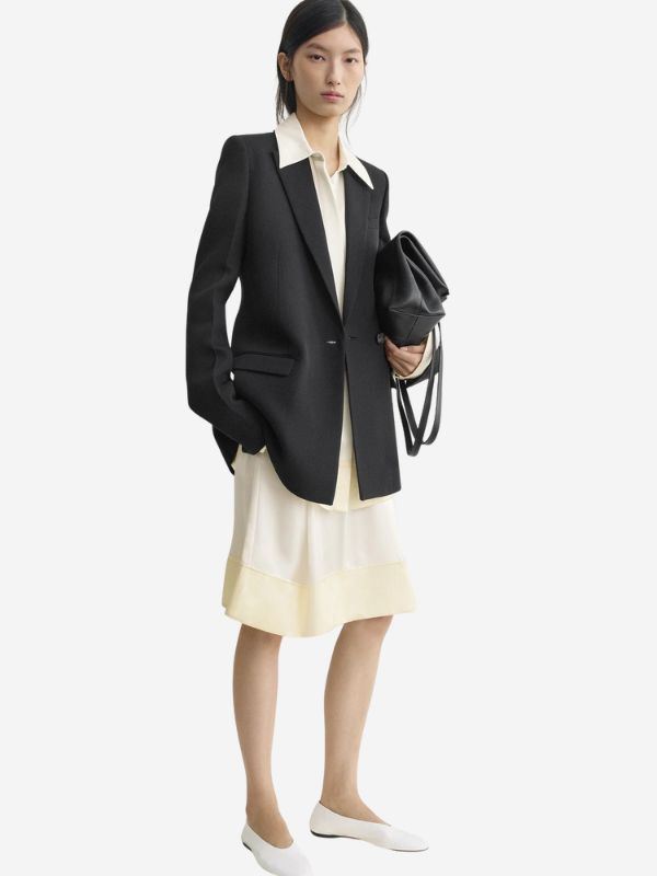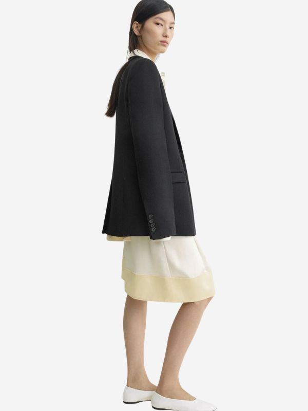 Side view of the Slim tailored black blazer by TOTEME highlighting its elegant silhouette