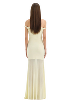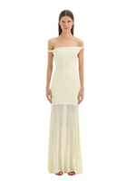 The Elia Off Shoulder Twist Dress by SIR. is a full length off the shoulder silhouette, featuring twist detail straps and a pleated skirt with a semi sheer finish in a midweight compact knit.
