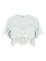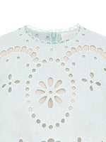 The Awaken Embroidered Bodice from Zimmermann's Resort Swim 2026 Collection. A linen top featuring short sleeves, an invisible centre back zip closure and scalloped trim at the sleeve cuffs and hem.