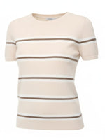 Staud Easy Cashmere Tee in Whisper Stripe showcasing the crew neckline and soft cashmere fabric.