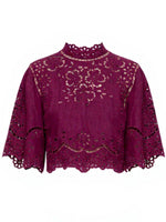 Lula Embroidery Top in Jam featuring intricate embroidered eyelet detailing throughout, showcasing its stylish high neck and short flowy sleeves, perfect for a fashionable look.