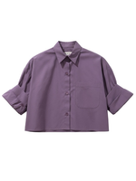 Next Ex in Black Plum cropped shirt showcasing boxy silhouette and chest patch pocket.