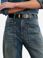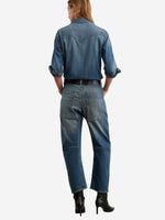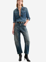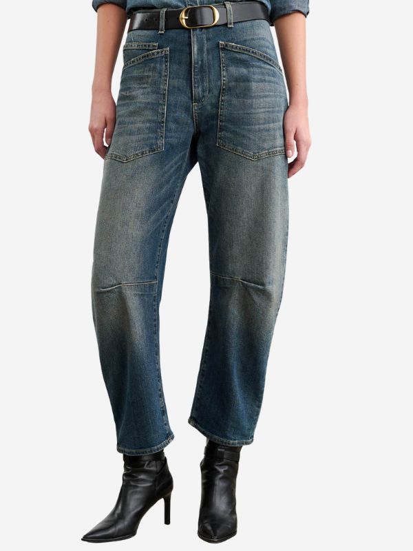 Nili Lotan's Shon Jean is a mid-rise, relaxed fit barrel leg  jean in Japanese stretch denim.  Uniquely curved silhouette. Seam detail at knees. Gusset at inseam. Zip fly. Hidden hook-and-bar closure. Hidden stay button closure. Top-stitched front and back patch pockets. Belt loops. Designed for a 26." inseam.