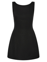The Sofia mini dress by FaithFull the Brand features a boat neckline and semi-fitted front bodice, from the waist it flares into a subtle A-line skirt that crops short on the body. The back is open with a feminine tie detail and elastic woven through the back waist.