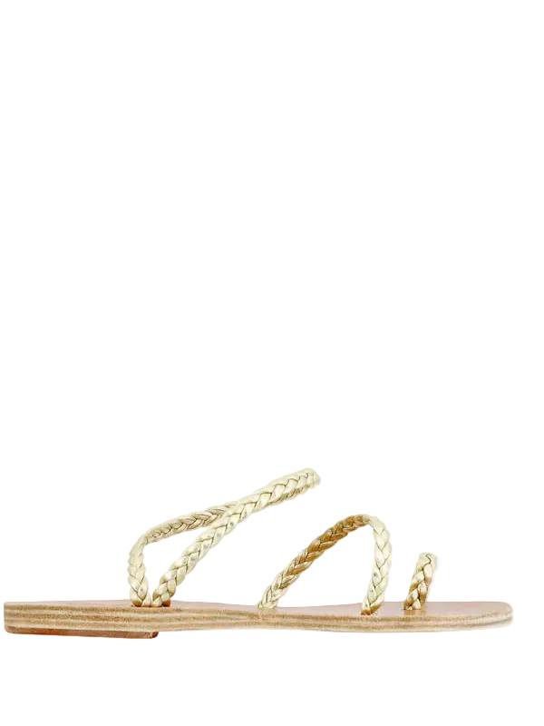 Angled view of Eleftheria in Platinum sandals by Ancient Greek, featuring an elegant woven design.