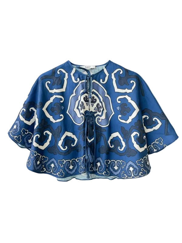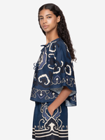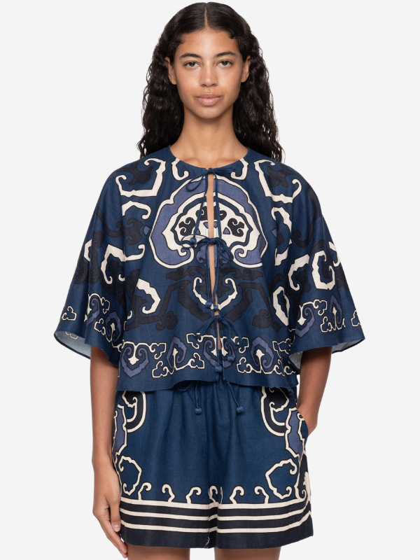 Close-up of the Blaise Top in Navy by Sea, highlighting its self-tie feature and intricate print details.