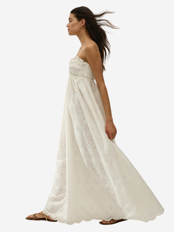 Side view of the Etta Maxi Dress in Bianca Broderie White by FaithFull, capturing the lightweight fabric and elegant silhouette.