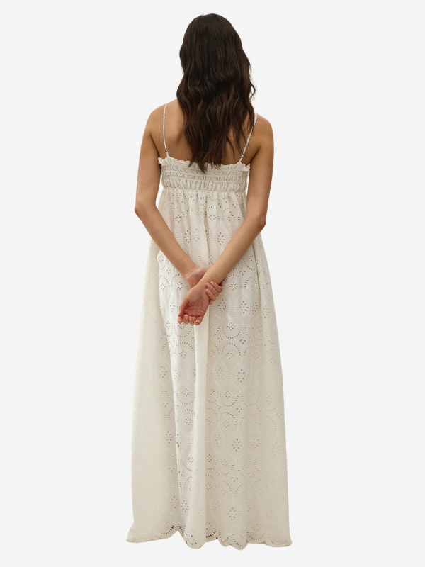 Back view of the Etta Maxi Dress in Bianca Broderie White by FaithFull, featuring adjustable straps and a flowing A-line skirt.