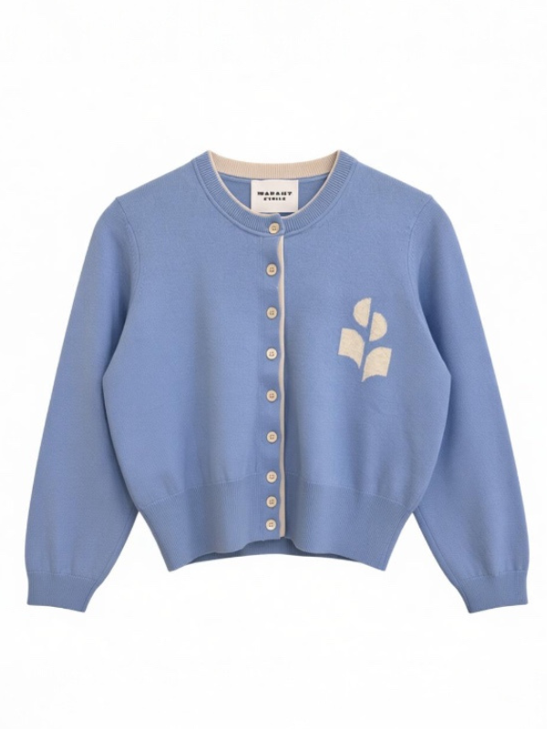 MARANT ÉTOILE'S Lona Cardigan is a cotton and wool blend knit sweater with a double rounded neckline with contrasting trim. Long sleeves, intarsia chest logo, and ribbed finishes. Fitted cut.