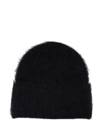 Close-up of the Alpaca Beanie Hat in Black by TOTEME, highlighting its fuzzy texture and quality knit.