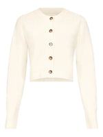 Flat lay of the Zephir Cropped Cashmere Cardigan in Ivory, illustrating its soft texture and premium cashmere fabric. A luxurious cropped cashmere cardigan to elevate your wardrobe.
