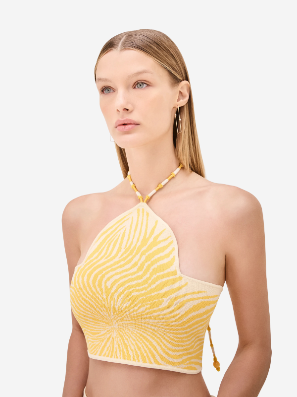Close-up of the beaded straps on the Gala Top in Yellow Bloom by Alexis.