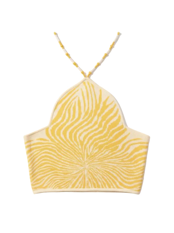 The Gala Top by Alexis is a knitted halter-style crop top featuring an abstract floral design. Beaded straps tie around the neck and two wide elastic straps span across the back. Pair with the Jazlyn Skirt.