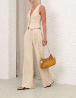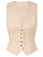 Close-up of Rebellion Pinstripe Waistcoat in Cream Stripe by Zimmermann, highlighting the linen texture and mock pockets.