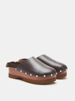 The Clog by Le Monde Béryl is handcrafted in chocolate leather with a mink shearling insole, silver tone stud detailing and a 50mm platform sole with anti-slip rubber grip. Slip on.