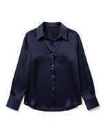 Close-up of the fabric texture of the Joey Shirt in Midnight, highlighting the semi-sheer silk georgette material perfect for a stylish look.