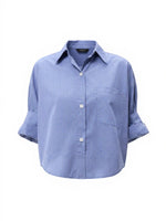 Stylish white and navy cropped button-down shirt from TWP's Next Ex collection.