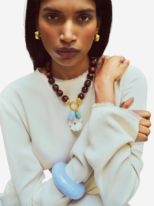 Lizzie Fortunato's Arc Cuff in marbled light blue resin looks stellar stacked or solo. Push this statement piece high up the forearm for a snug fit and editorial look.
