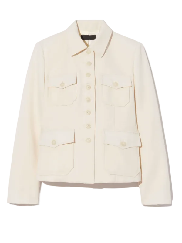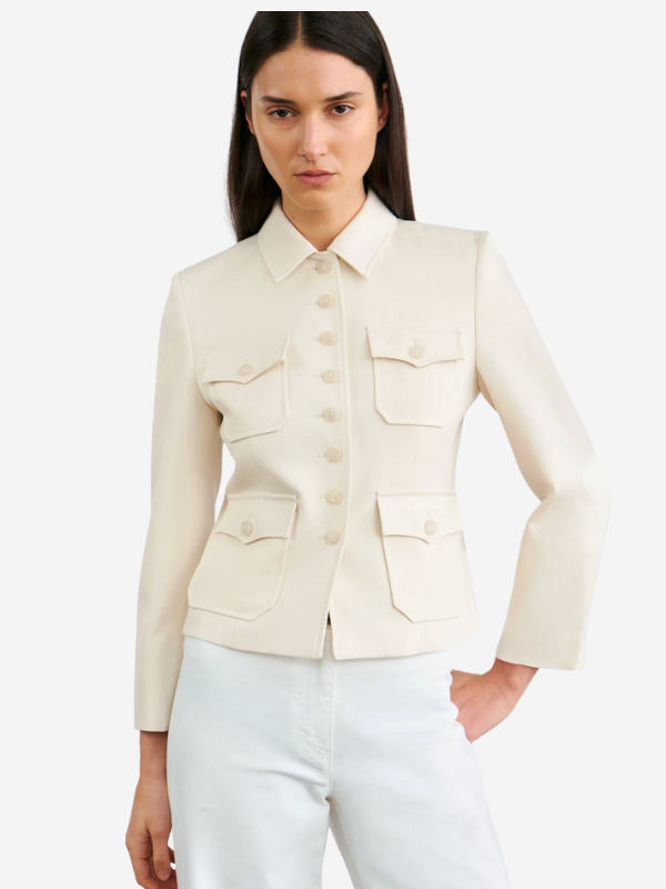 Close-up of the Jamison Jacket in Stone by Nili Lotan, emphasizing the button detail and pocket design.