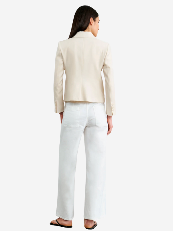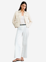 Model showcasing the Jamison Jacket in Stone by Nili Lotan, styled with wide-leg white pants for a chic, casual look.