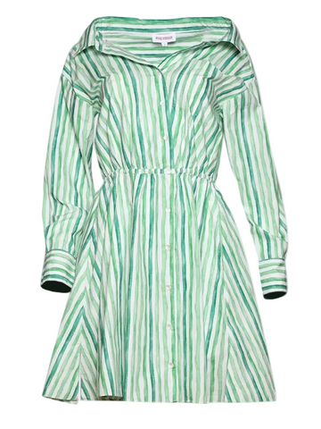Falling Off the Shoulder Mini Dress in Watercolor Stripe Green