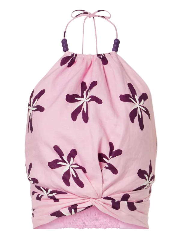 The Lodi top by Cala de la Cruz is a crop halter silhouette feature front detail design, cinched back for comfort and beaded neckties.