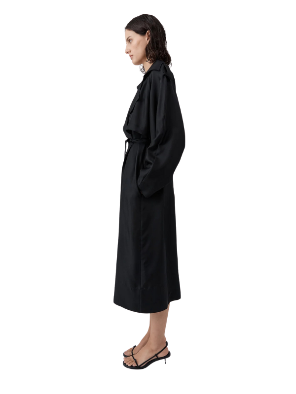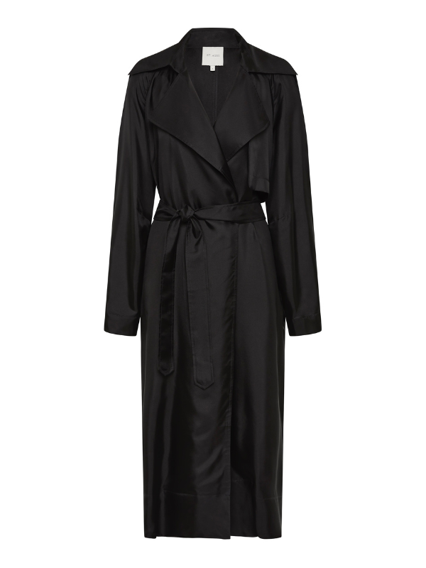 Close-up of the Silk Twill Relaxed Trench in Black, showcasing the luxurious 100% silk fabric and raglan sleeves.