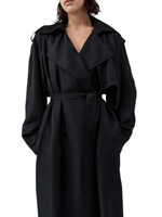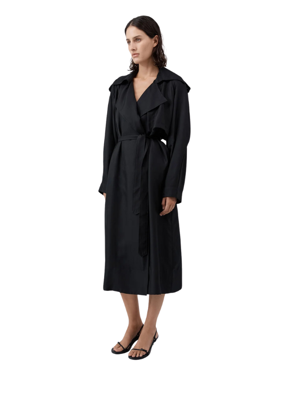 Model wearing the Silk Twill Relaxed Trench in Black, highlighting its relaxed fit and elegant style.